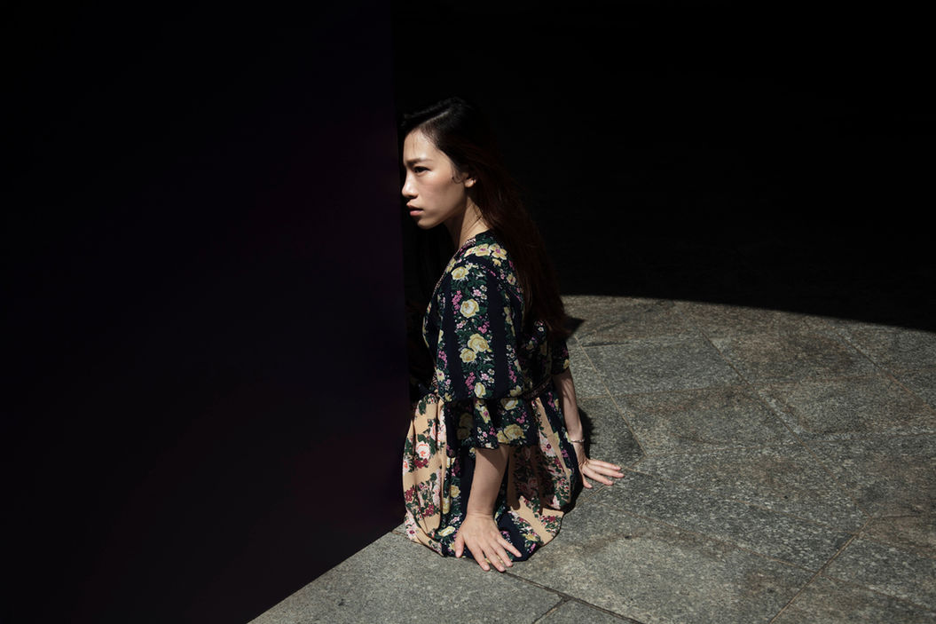 Shirley是專業的彩妝師,她時常與不同的攝影師合作,對於模特兒擺拍的動作也很熟悉,因此拍照時我提出一個點子或是希望她能擺出的動作,馬上就能有不錯的互動和回饋。今天陽光強烈,我想嘗試一些光影的效果,像是陽光穿透黃色玻璃紙映射在牆上呈現如絲綢般的流動感,或是將上半身隱藏在影子之中,營造出具有故事性和想像空間的畫面。